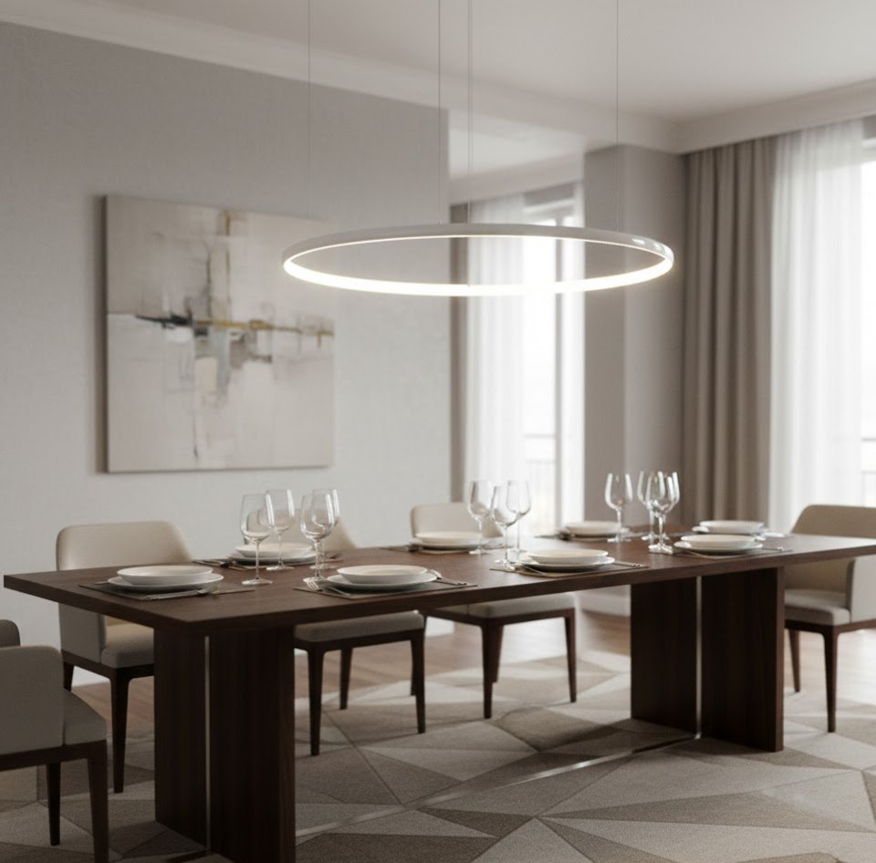 Вдоль всего корпуса проходит гибкий рассеиватель из опалового материала (силикона/резины), который скрывает встроенные светодиоды и обеспечивает мягкое, абсолютно равномерное свечение без видимых точек. Светильник подвешен на тонких стальных тросиках, создавая эффект парения в воздухе. Эта модель идеально подходит для освещения гостиных, спален, кухонь или коммерческих пространств в стиле хай-тек, сканди или минимализм.
