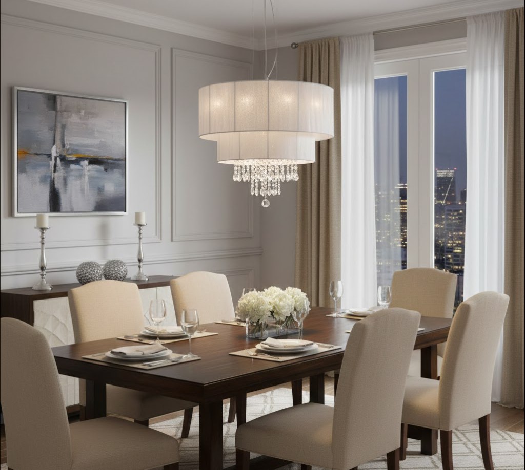 Главный элемент дизайна — большой кольцевой абажур белого цвета (выполнен из ПВХ с фактурным покрытием из нитей), который скрывает лампы и мягко рассеивает свет. Такое решение создает комфортное, безбликовое освещение и добавляет интерьеру воздушности. Люстра диаметром 710 мм на 6 ламп станет стильным центром гостиной, спальни или столовой зоны.