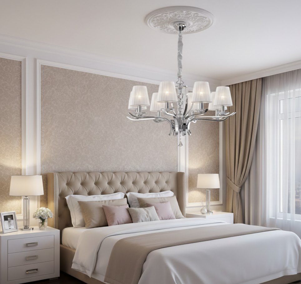 Люстра оснащена 8 рожками, каждый из которых дополнен изящным текстильным абажуром из белой органзы. Ткань мягко рассеивает свет, наполняя интерьер уютом. Дополнительное сияние изделию придают декоративные подвески из прозрачного хрусталя. Благодаря внушительному диаметру 920 мм, эта модель станет эффектным центром просторной гостиной, столовой или спальни.