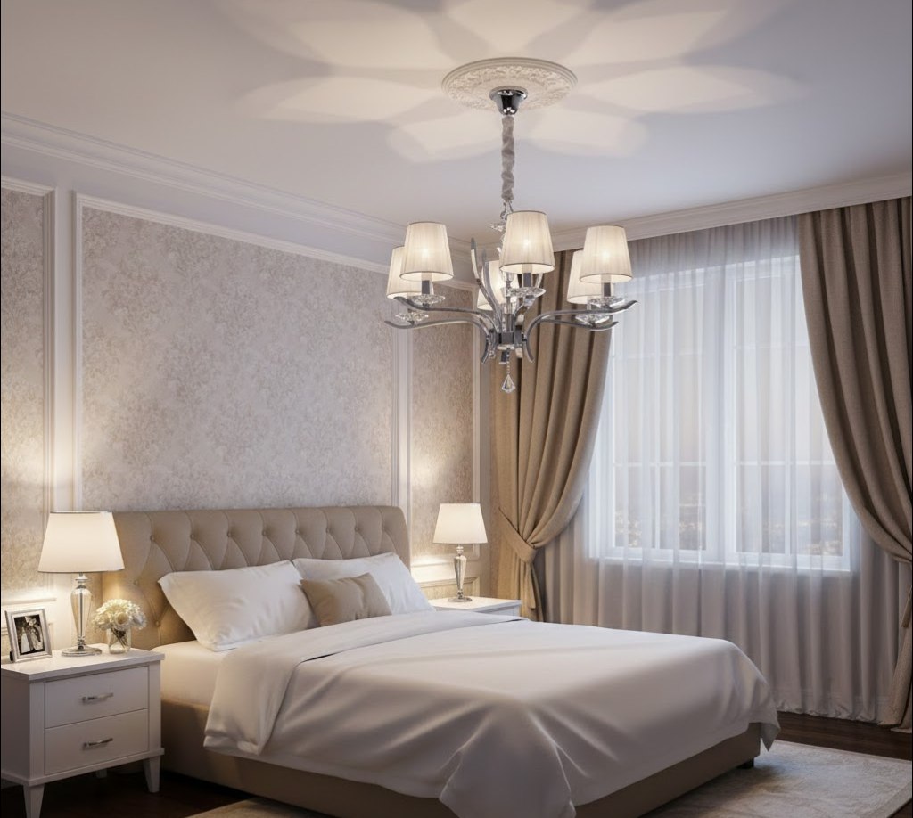 Люстра оснащена 5 рожками, каждый из которых дополнен элегантным текстильным абажуром из белой органзы. Ткань мягко рассеивает свет, создавая уютную, романтичную атмосферу. Дополнительный шарм изделию придают декоративные подвески из хрусталя, играющие на свету. Диаметр 720 мм делает эту модель идеальным выбором для спальни, уютной гостиной или столовой зоны.