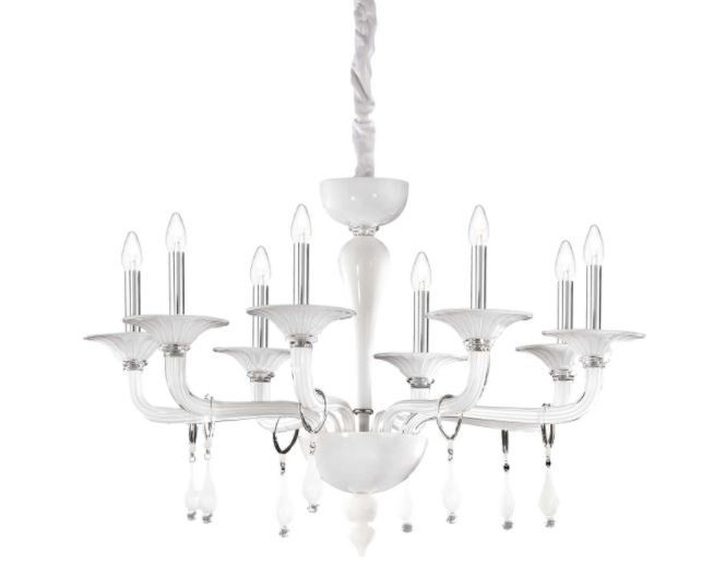 Подвесная люстра MIRAMARE SP8 068190 от итальянского бренда Ideal Lux — это утонченный светильник, который гармонично сочетает в себе венецианские традиции и уютный стиль прованс. Арматура выполнена из металла с покрытием хром, но корпус, чаши и изогнутые рожки изготовлены из белого дутого стекла ручной работы.