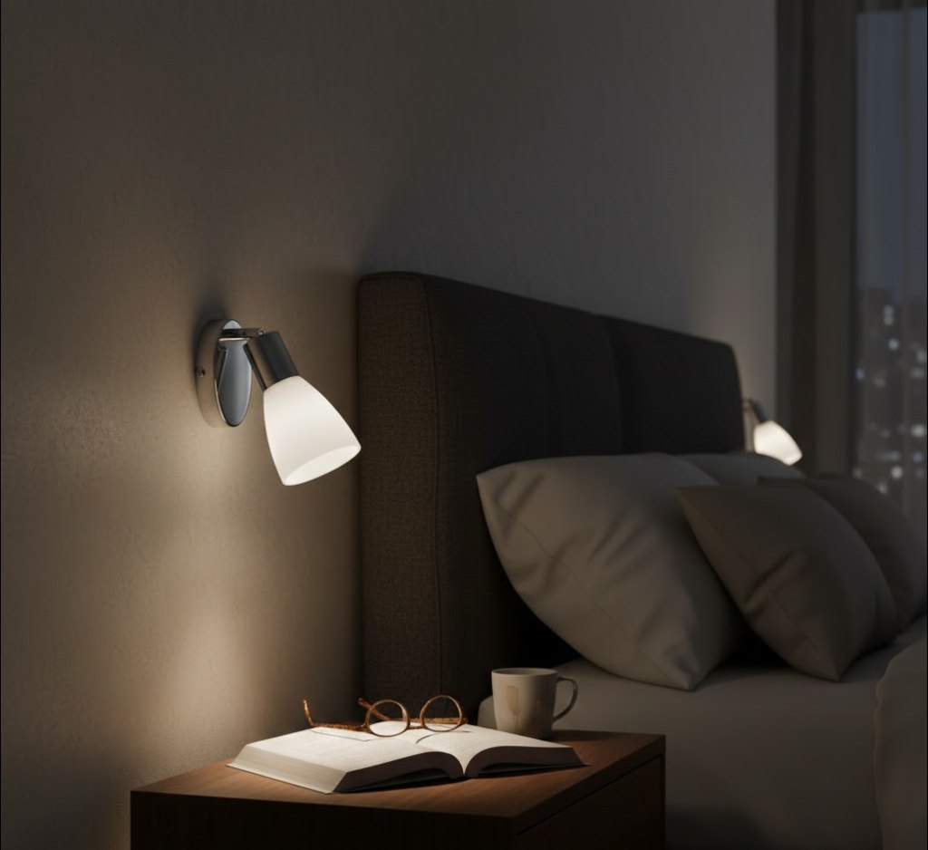 Плафон изготовлен из белого дутого стекла с кислотным травлением (матовый эффект), имеет цилиндрическую форму и мягко рассеивает свет. Главная особенность модели — возможность регулировки направления светового потока, что делает это бра идеальным вариантом для подсветки зеркал, картин или использования в качестве лампы для чтения в спальне.