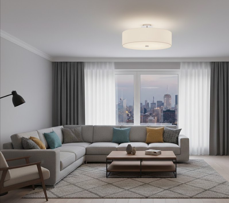 Конструкция состоит из металлического основания и большого абажура, выполненного из ткани в универсальном белом цвете. Благодаря диаметру 500 мм и патронам E27, светильник обеспечивает яркое, но при этом максимально мягкое и рассеянное освещение, идеально подходящее для гостиной, спальни или детской комнаты. Сочетание металла и ткани создает уютный и современный образ.