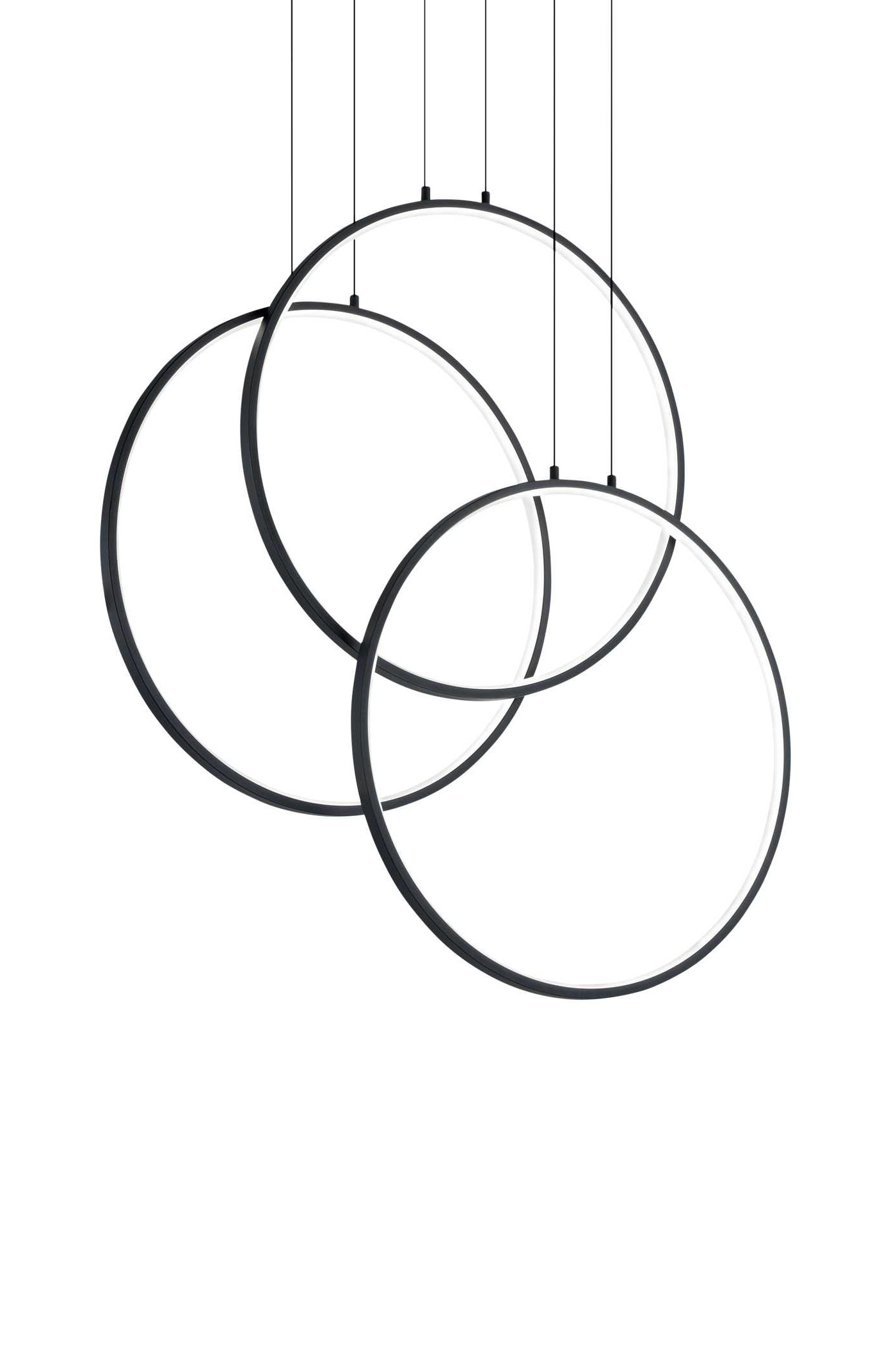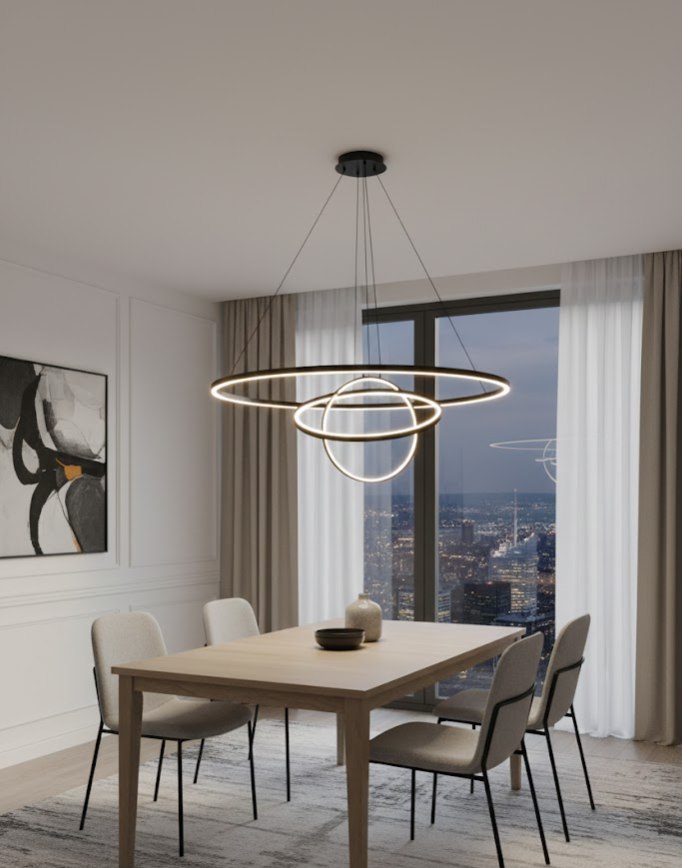 Светильник оснащен интегрированным LED модулем, который закрыт опаловым пластиковым рассеивателем. Это создает мягкую, непрерывную световую линию по контуру кольца без видимых точек светодиодов. Люстра крепится на тонких стальных тросах, благодаря чему создается эффект парящего в воздухе светящегося обруча. Модель идеально подходит для освещения обеденной зоны, гостиной или современного офиса.