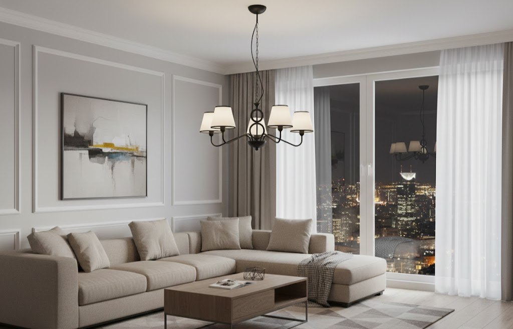 Люстра оснащена 5 рожками, каждый из которых увенчан классическим конусообразным текстильным абажуром белого цвета. Такой контраст черного и белого делает светильник ярким акцентом в интерьере, при этом сохраняя его элегантность. Тканевые плафоны мягко рассеивают свет, создавая уютную атмосферу. Благодаря диаметру 840 мм, эта модель отлично подойдет для освещения просторной гостиной, спальни или столовой зоны.
