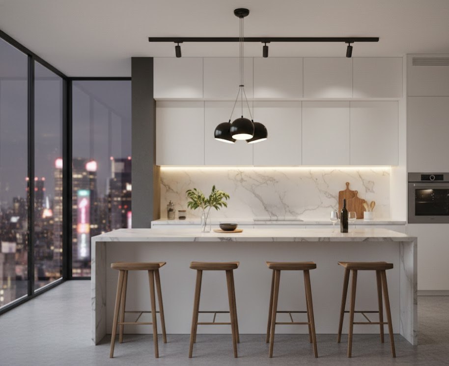 Корпус изготовлен из прочной лакированной стали. Внешняя сторона плафонов выполнена в строгом черном цвете, а внутренняя поверхность окрашена в белый цвет. Такое решение не только создает эффектный контраст, но и отлично отражает свет, делая его ярче и чище. Благодаря общему диаметру конструкции 340 мм, светильник идеально подходит для основного освещения небольшой кухни, зонирования пространства над круглым обеденным столом или создания уютной атмосферы в гостиной.