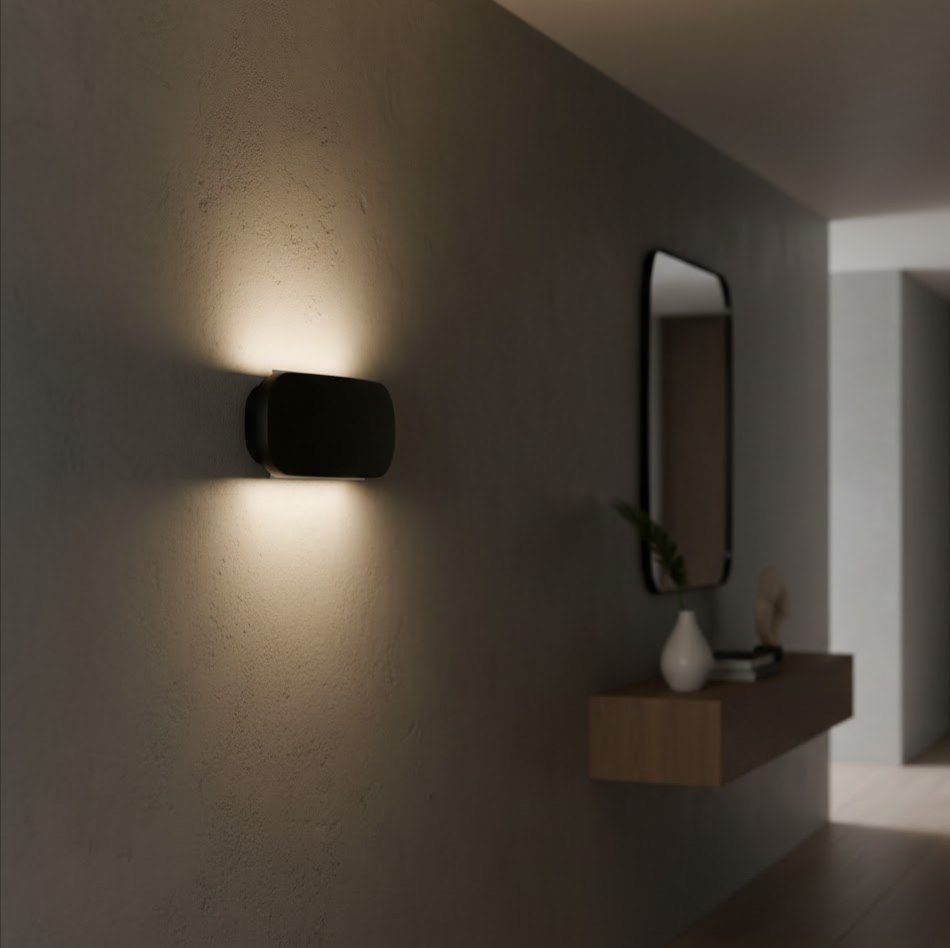 Конструкция предполагает скрытое размещение источника света, создавая эффект мягкого, непрямого освещения. Свет струится из-под черной панели (видна небольшая белая часть корпуса сзади), образуя красивый световой ореол на стене сверху и снизу. Это идеальное решение для создания атмосферной подсветки в гостиных, коридорах, спальнях или современных офисных пространствах, оформленных в стилях лофт, хай-тек или минимализм.