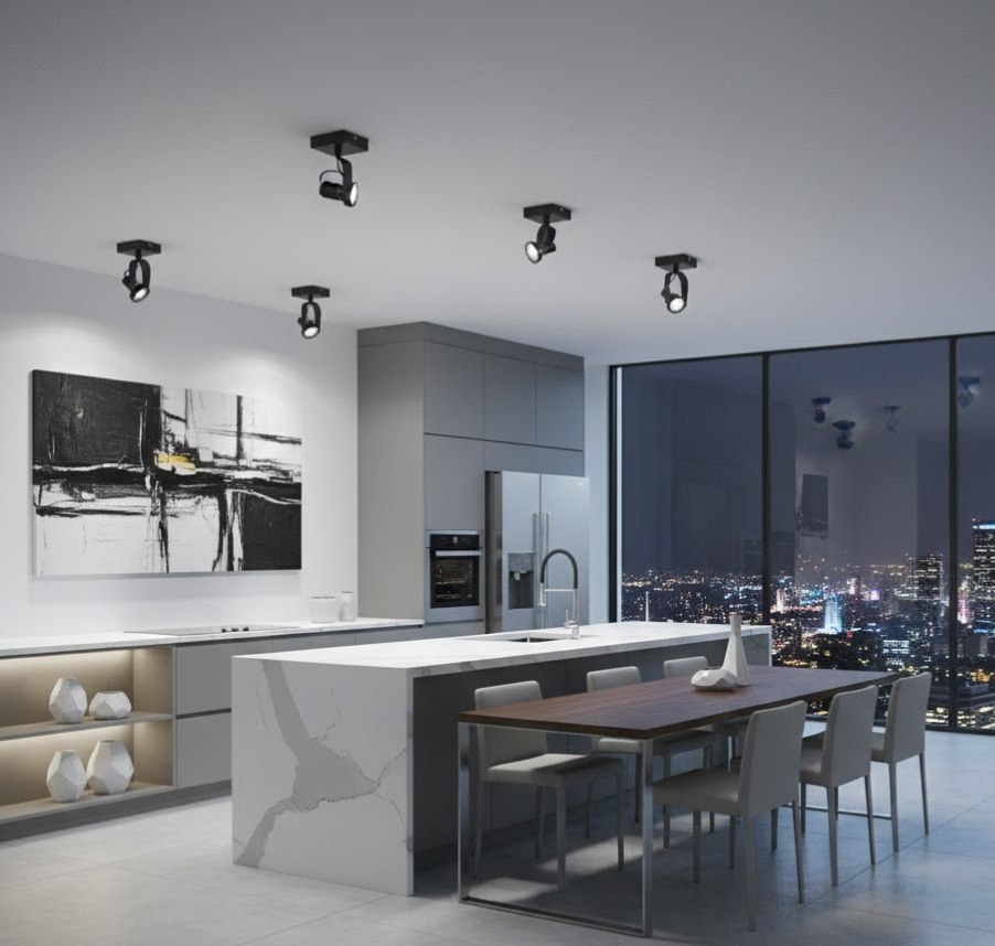 Корпус окрашен в глубокий матовый черный цвет, что делает светильник универсальным акцентом для интерьеров в стиле лофт, минимализм или хай-тек. С высотой 140 мм, этот «стакан» не только выполняет функцию освещения, но и служит заметным декоративным элементом потолка, создавая ритм и объем. Светильник оснащен патроном под лампу с цоколем GU10, что позволяет создать качественное направленное освещение, идеально подходящее для зонирования пространства, подсветки коридоров, кухонных поверхностей или гардеробных.