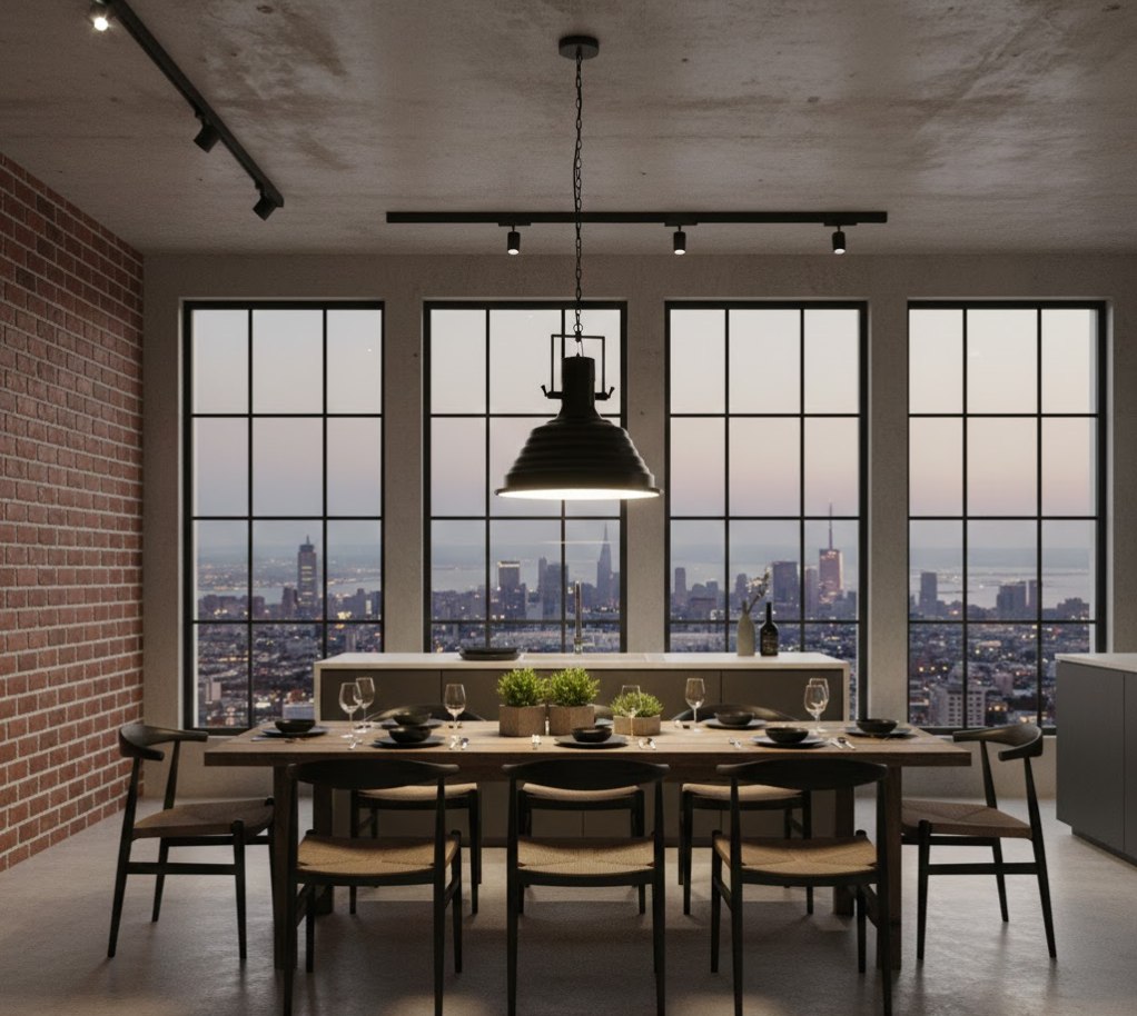 Особенностью модели является нижний рассеиватель, выполненный из стеклянной пластины с белой трафаретной печатью. Этот элемент скрывает лампу и мягко распределяет свет, исключая слепящий эффект и создавая комфортное освещение. Благодаря внушительному диаметру 485 мм, светильник станет выразительным акцентом над обеденным столом, в кухне, загородном доме или интерьере в стиле индастриал.