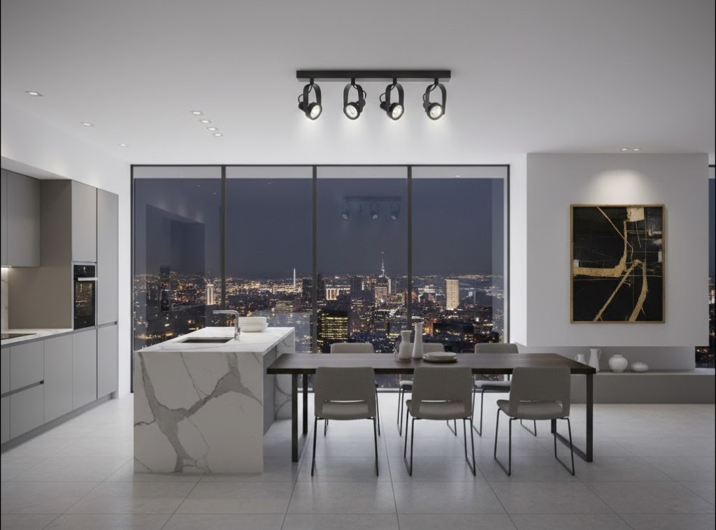 Светильник выполнен из прочного металла, окрашенного в матовый черный цвет, что придает ему строгий и технологичный вид. С высотой корпуса 140 мм, он смотрится компактно, но при этом обеспечивает мощный световой поток благодаря четырем лампам. Это идеальный вариант для освещения коридоров, прихожих, кухонных зон или гостиных, где требуется яркий свет без использования громоздких люстр. Использование цоколей GU10 позволяет легко подобрать лампы нужной цветовой температуры и мощности.
