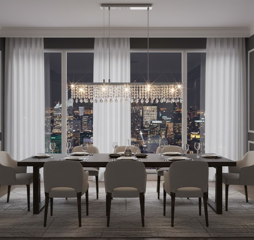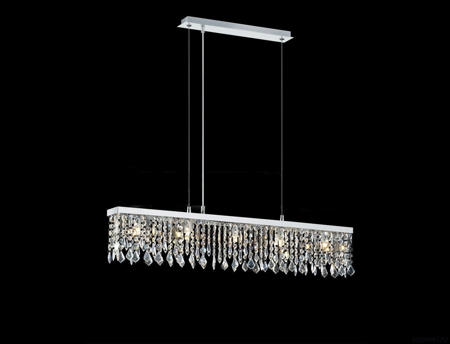 Дизайн модели построен на строгой геометрии: линейный корпус декорирован рядами прозрачных хрустальных элементов квадратной формы. Хрусталь преломляет свет от 5 ламп, создавая красивую игру бликов и наполняя пространство торжественным сиянием. Благодаря своей вытянутой форме (длина 850 мм), этот светильник идеально подходит для размещения над обеденным столом, кухонным островом или барной стойкой, добавляя интерьеру гламура и блеска.