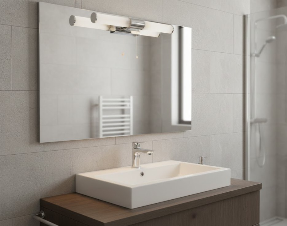 Плафон изготовлен из белого стекла (матового или опалового), которое мягко рассеивает свет, создавая яркое, но комфортное освещение без слепящего эффекта. Светильник идеально подходит для размещения над зеркалом или по бокам от него, обеспечивая правильный свет для косметических процедур.
