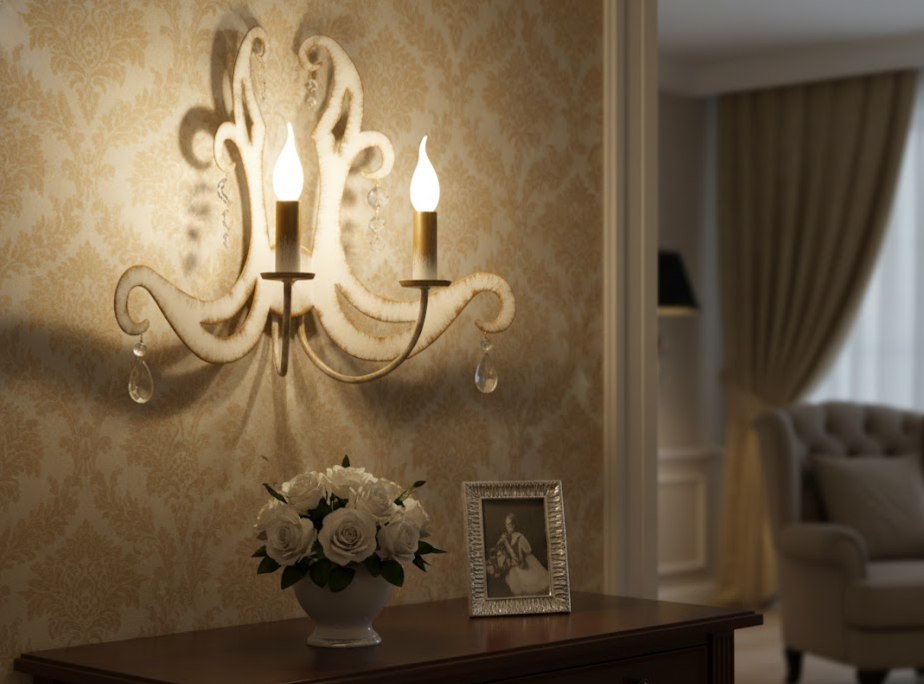 Два плафона из белого стекла (обычно с матовой или алебастровой фактурой) имеют форму раскрытых чаш и направлены вверх. Использование компактных патронов E14 позволяет сохранить изящные пропорции светильника. Модель обеспечивает мягкое и достаточно яркое освещение, идеально подходящее для классических гостиных, спален или холлов.