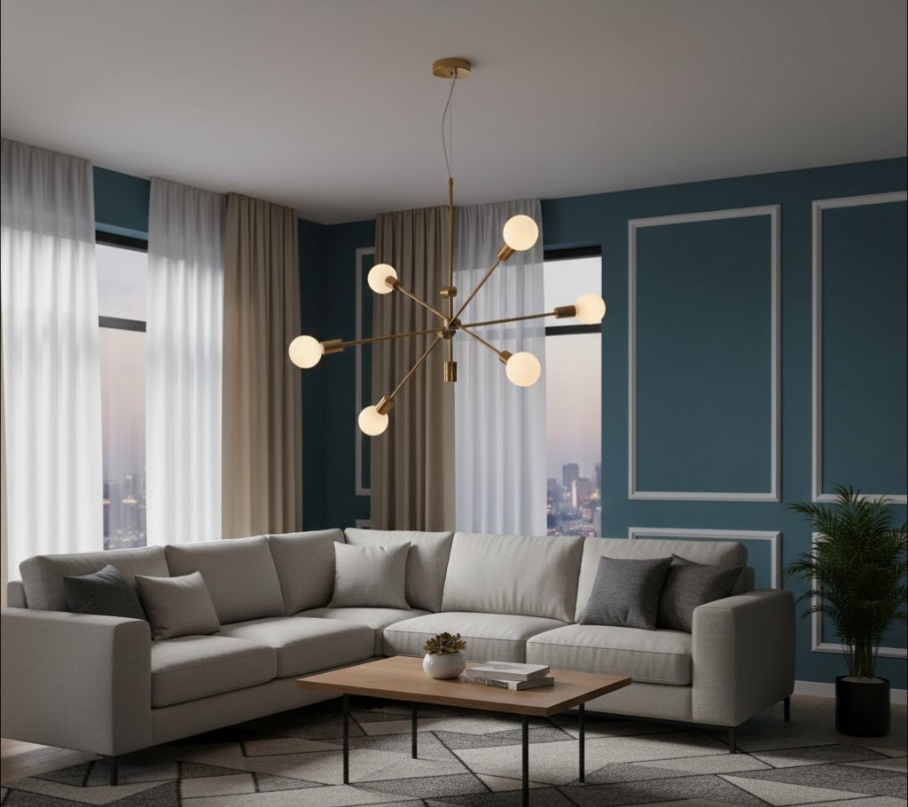 Подвесной светильник FLASH FR5043PL-06BS от немецкого бренда Freya — это стильное воплощение дизайна mid-century modern и скандинавского лофта. Модель отличается выразительной геометрией: от центрального основания расходятся прямые металлические лучи, окрашенные в благородный цвет латуни. Конструкция напоминает молекулярную связь или схематичное изображение звезды. Люстра лишена плафонов, оставляя источники света открытыми, что придает изделию визуальную легкость и графичность. Благодаря внушительному диаметру (83 см), этот «световой паук» станет доминирующим акцентным элементом в современной гостиной, квартире-студии или над большим обеденным столом.