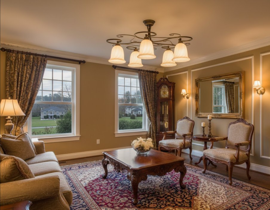 Арматура светильника изготовлена из металла с отделкой медного цвета, что придает ему богатый, традиционный вид. Конструкция дополнена элементами из стекла бежевого или матового оттенка. Сочетание меди и бежевого цвета создает теплую, благородную атмосферу. Наличие нескольких патронов с цоколем E27 обеспечивает яркое и равномерное освещение, соответствующее масштабу светильника.