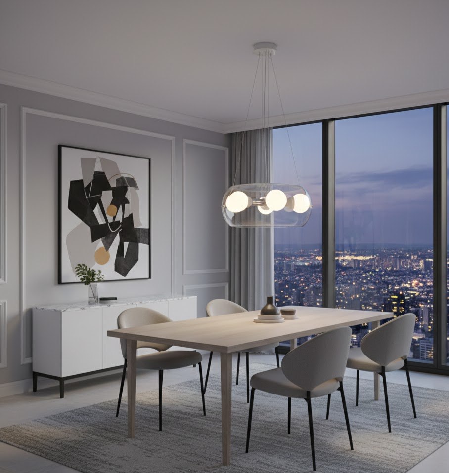 Внутри стеклянного купола на тонких стальных тросиках закреплена хромированная конструкция с источниками света. Благодаря использованию цоколя E27, светильник является универсальным и практичным в обслуживании. Абсолютная прозрачность стекла создает эффект легкости и парения, не загромождая пространство. Модель идеально подходит для освещения гостиной, столовой зоны или спальни в стиле хай-тек или минимализм.